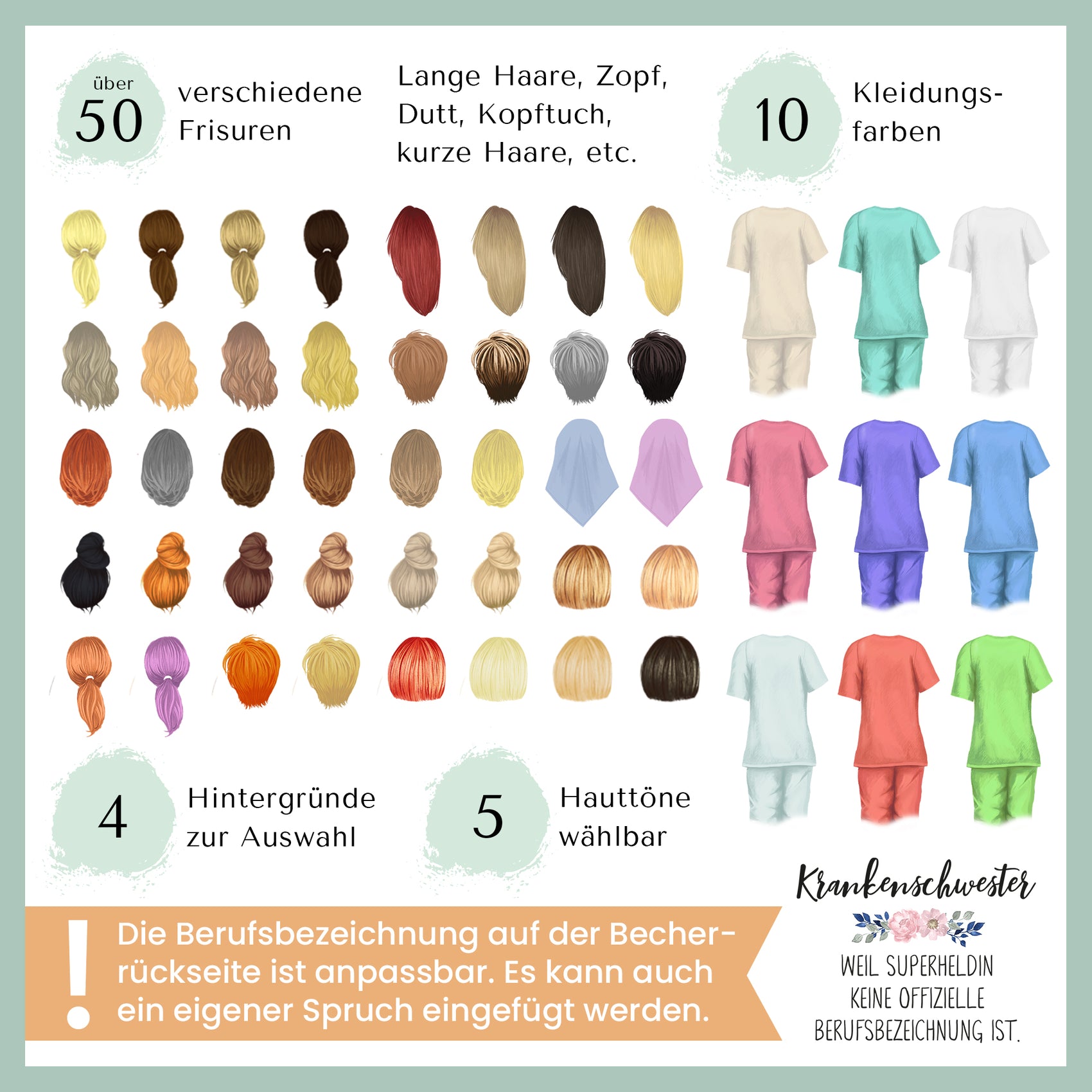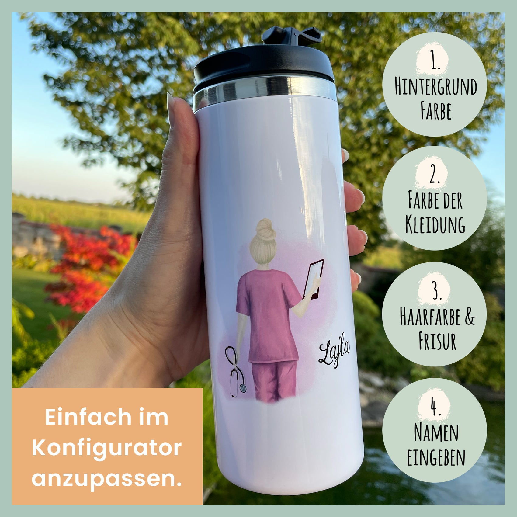 Individuelle Krankenschwester Geschenke : Wähle im Konfigurator zwischen zahlreichen Optionen. Du kannst den Hintergrund, die Hautfarbe, die Frisur, die Farbe der Kleidung und den Namen anpassen. Der optionale Aquarell-Hintergrund wirkt sehr edel und feminin auf den hochweißen Edelstahl Bechern.